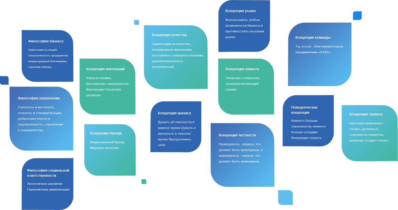 честность в бизнес, стандартизированное управление, экологичное производство, преданность обществу -